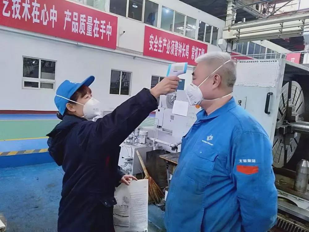 北重集团为在岗工作人员准备了洗手液、口罩、喷壶等消毒防护器材,对进入厂房人员严格登记和测量体温,对工作人员一日四次检测体温并进行记录,在做好疫情防控的同时保证生产。