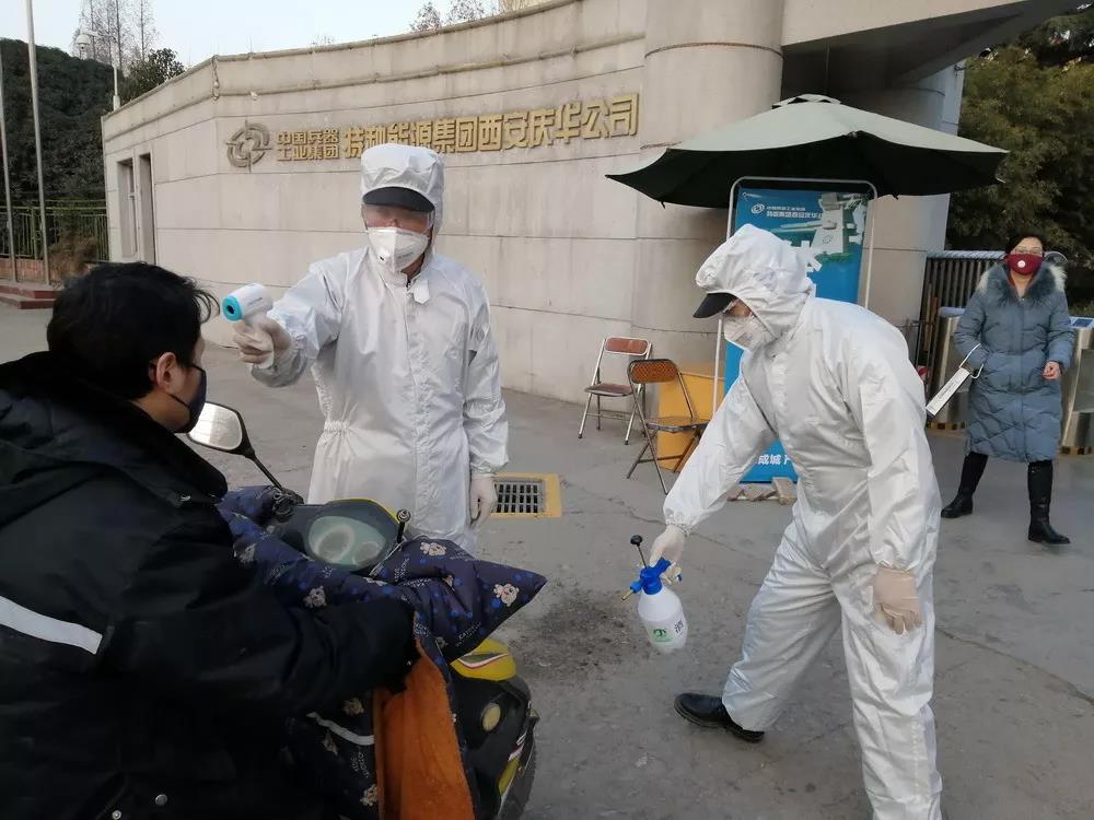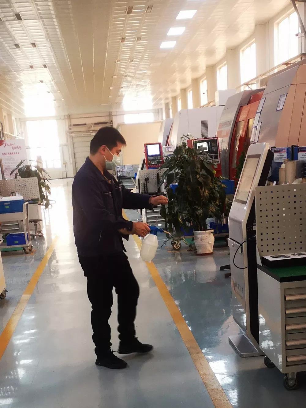 一机集团对出入人员进行体温检测;对各办公场所、生产现场均利用消毒液进行消毒。同时积极开展测温仪、体温计、消毒液、紫外线消毒灯、防护口罩等物资筹备,做好假期后生产启动准备。