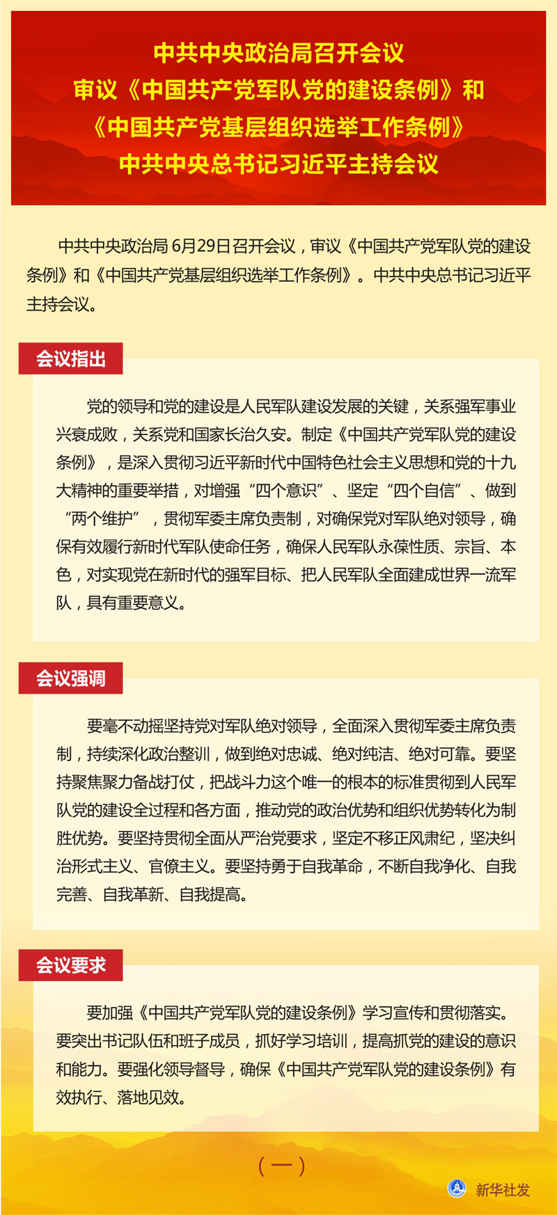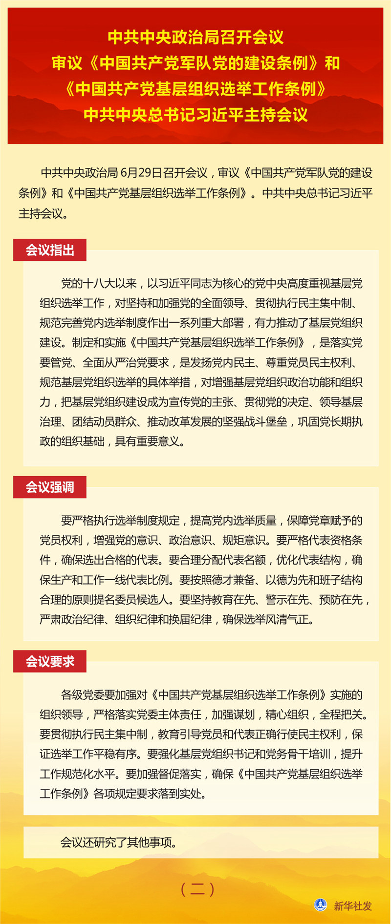 新华社北京6月29日电  中共中央政治局6月29日召开会议,审议《中国共产党军队党的建设条例》和《中国共产党基层组织选举工作条例》。中共中央总书记习近平主持会议。