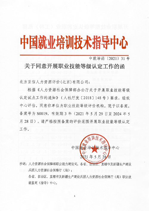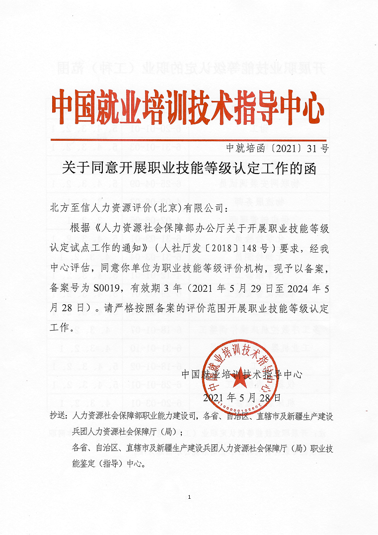 5月28日,人力资源社会保障部中国就业培训技术指导中心发布了《关于同意开展职业技能等级认定工作的函》(中就培函〔2021〕31号),北方至信人力资源评价(北京)有限公司(以下简称“北方至信”)成为首家央企全国性社会培训评价组织职业技能等级认定机构。