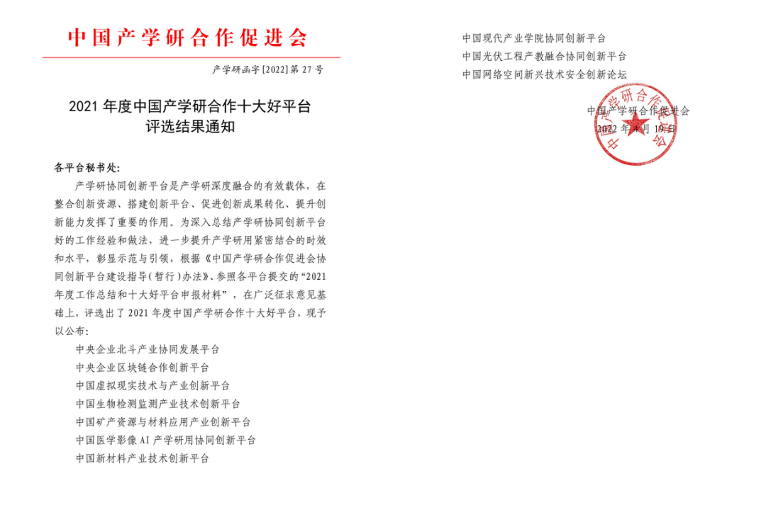 4月19日,在中国产学研合作促进会主办的2021年度产学研协同创新平台评选工作中,中央企业北斗产业协同发展平台获评“中国产学研合作十大好平台”。