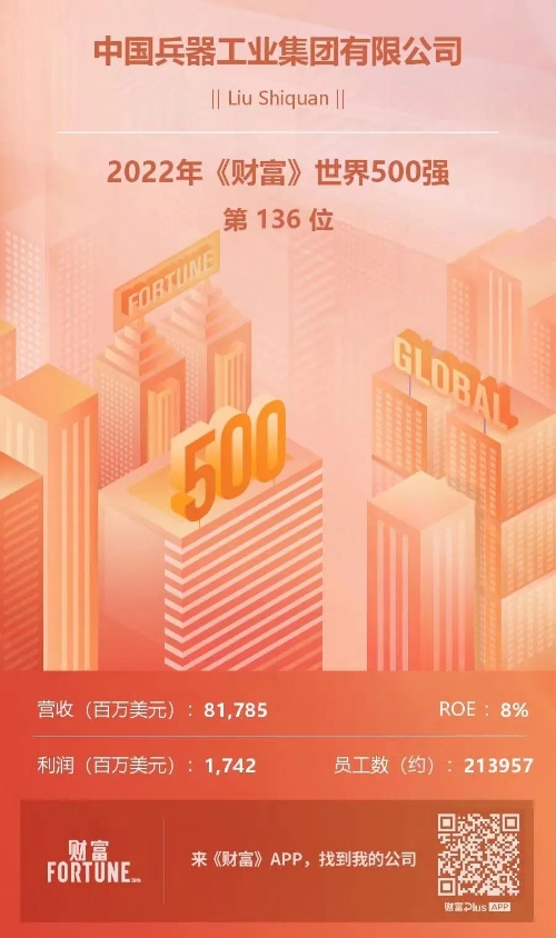 兵器工业集团位列2022年《财富》世界500强第136位