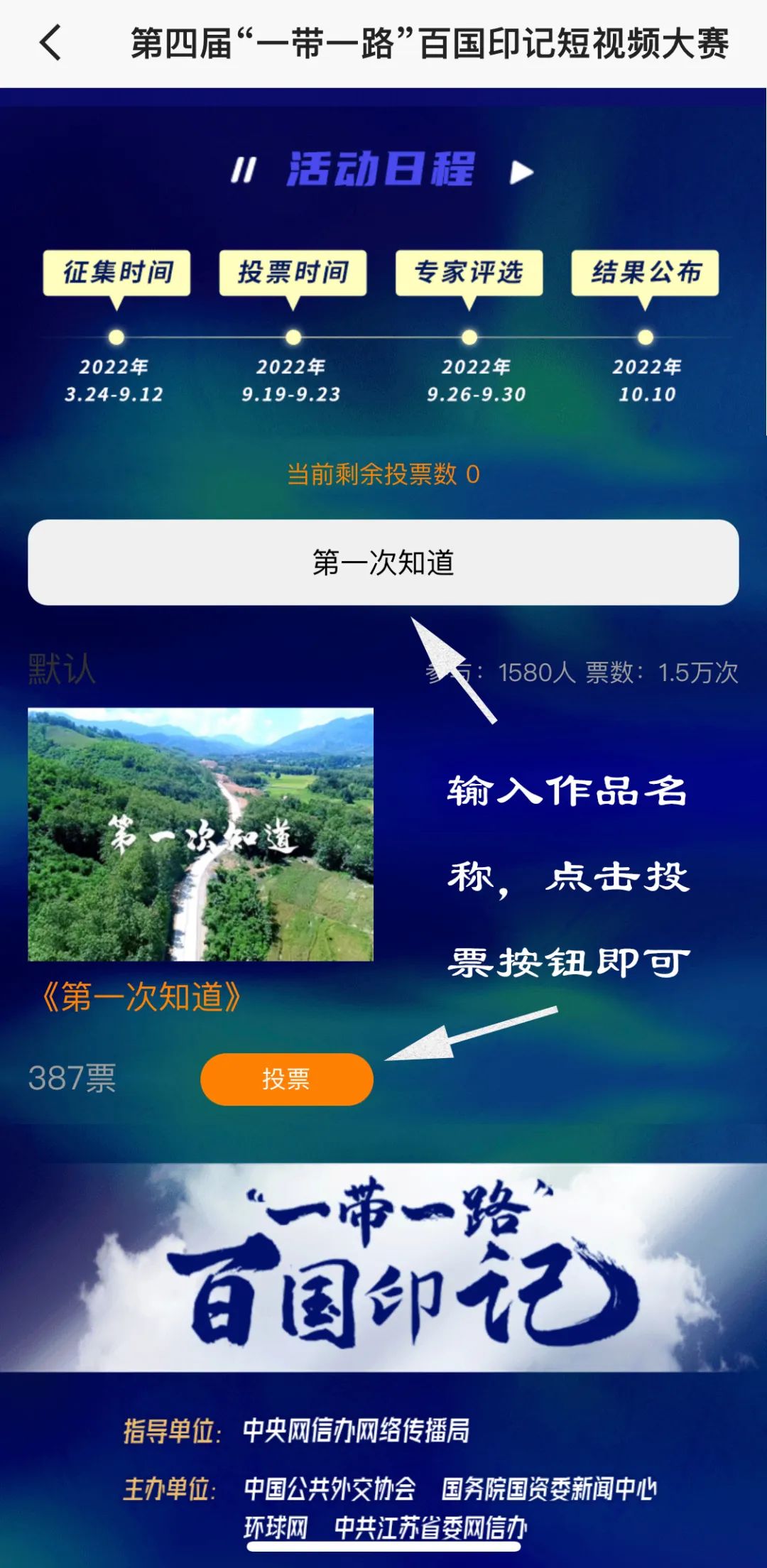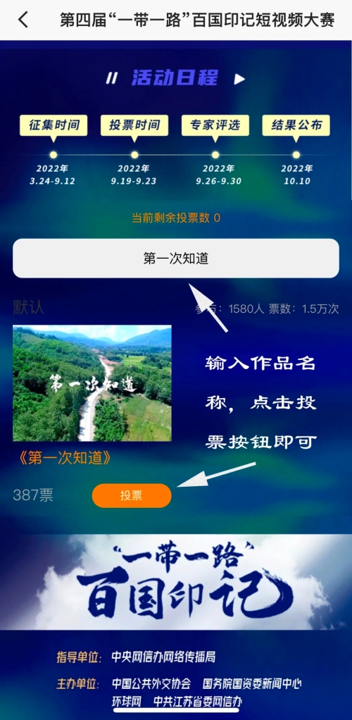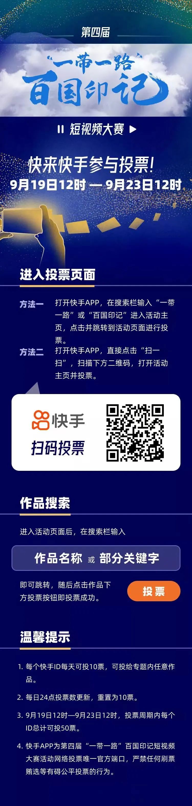 9月19日,由中央网信办网络传播局指导,中国公共外交协会、国务院国资委新闻中心、环球网和中共江苏省委网信办联合主办的第四届“一带一路”百国印记短视频大赛完成作品征集,正式开启投票阶段。