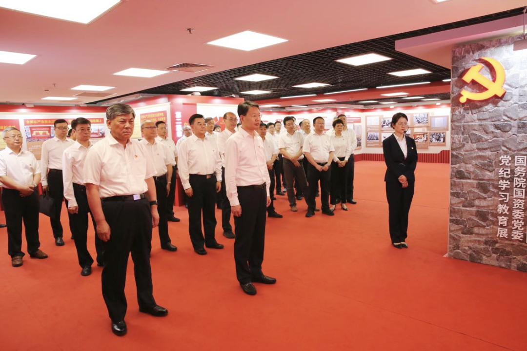 党组同志认真聆听讲解,集体参观了“政治铸魂——习近平总书记重要论述”“纪法树威——党规党纪相关要求”“传承增信——党的优良传统”“严管促行——国务院国资委党委纪律建设成效”“警示立戒——反面典型案例”“实干建功——工作展望”6个篇章,通过观看图文、视频等形式多样的展品展示,进一步学习领会习近平总书记关于国资央企的重要指示批示精神和党的纪律建设的重要论述,学习把握《中国共产党纪律处分条例》新增、修订内容,全面了解国务院国资委党委强化政治引领、加强政治监督、深化纪律建设、抓实巡视工作等方面的做法举措,集中观看近年来国资央企发生的具有代表性的违规违纪案例,深刻领悟以习近平同志为核心的党中央坚持党要管党、全面从严治党取得的历史性成就,全面感受国务院国资委党委全面从严治党取得的重要成果。