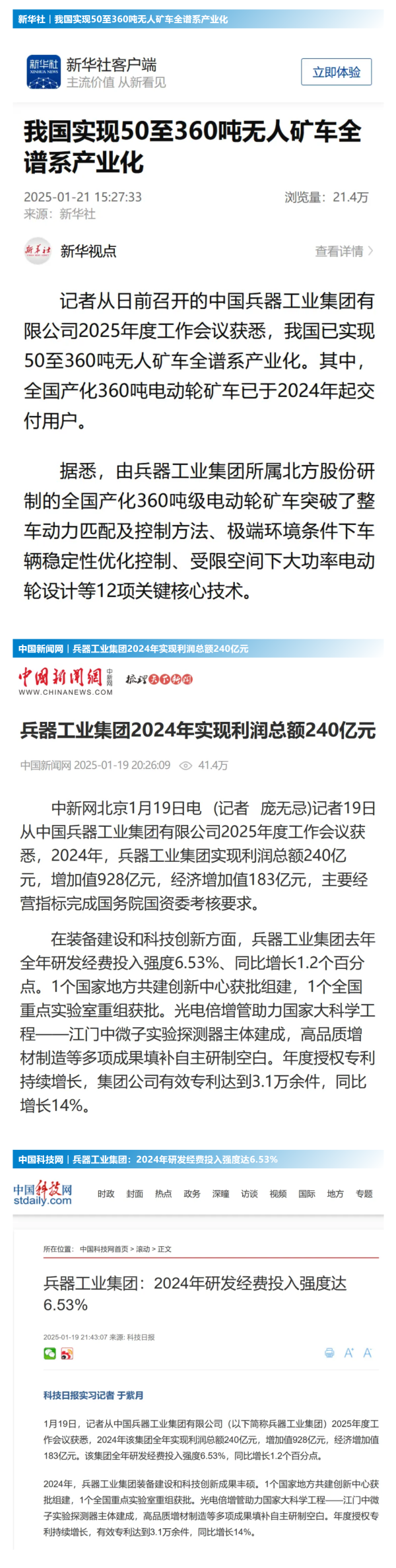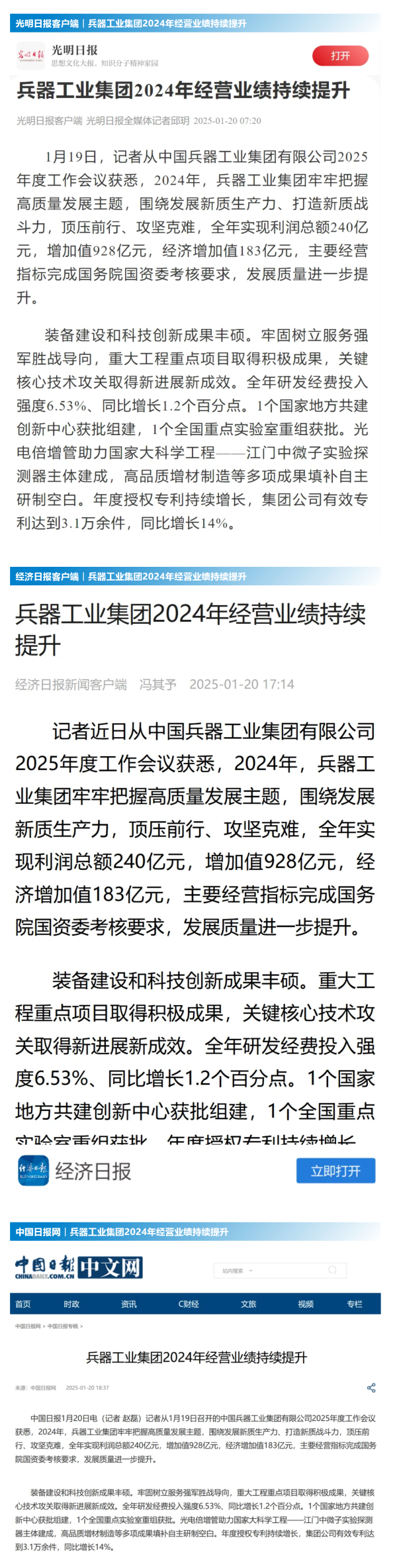 1月19日至20日,世界杯竞猜网站2025年度工作会议在京召开,会议总结2024年工作,分析形势任务,明确工作思路,部署2025年工作。 集团公司2024年取得的成绩及下一步重点工作受到社会媒体广泛关注。新华社、中国新闻网、中国科技网、光明日报客户端、经济日报客户端、中国日报网、国务院国资委网站、学习强国中央企业学习平台、新浪网、网易网、搜狐网、腾讯网、凤凰网等中央主流媒体、国家部委网站及知名网络媒体对集团公司2025年度工作会议进行了报道,重点关注集团公司经营业绩、科技创新、产业结构布局优化等情况。其中,新华社以《我国实现50至360吨无人矿车全谱系产业化》为题,重点报道了集团公司在推动智能制造水平提升方面取得的成效;中国新闻网、光明日报客户端、经济日报客户端、中国日报网等就集团公司2024年度经营业绩及各项工作取得的成果进行报道;中国科技网着重报道了集团公司在科技创新和优化产业结构布局方面的最新进展。集团公司门户网站、微信公众号、微博等新媒体平台以及《中国兵工报》也对集团公司工作会议进行了及时报道,各成员单位纷纷对相关内容进行转载,引发全系统关注。 集团公司职工及广大网友热议工作会 “2025年工作会为我们指明了发展方向、明确了奋斗目标,面对全新的机遇和挑战,作为兵工人深感责任重大。” “科技是第一生产力,一定要以科技创新引领新质生产力发展,为高质量发展提供支撑。” “把各项工作做深、做实、做细,努力为集团公司高质量发展添砖加瓦。” “2024年中国兵器展示了大国重器,祝新的一年中再创辉煌!” |